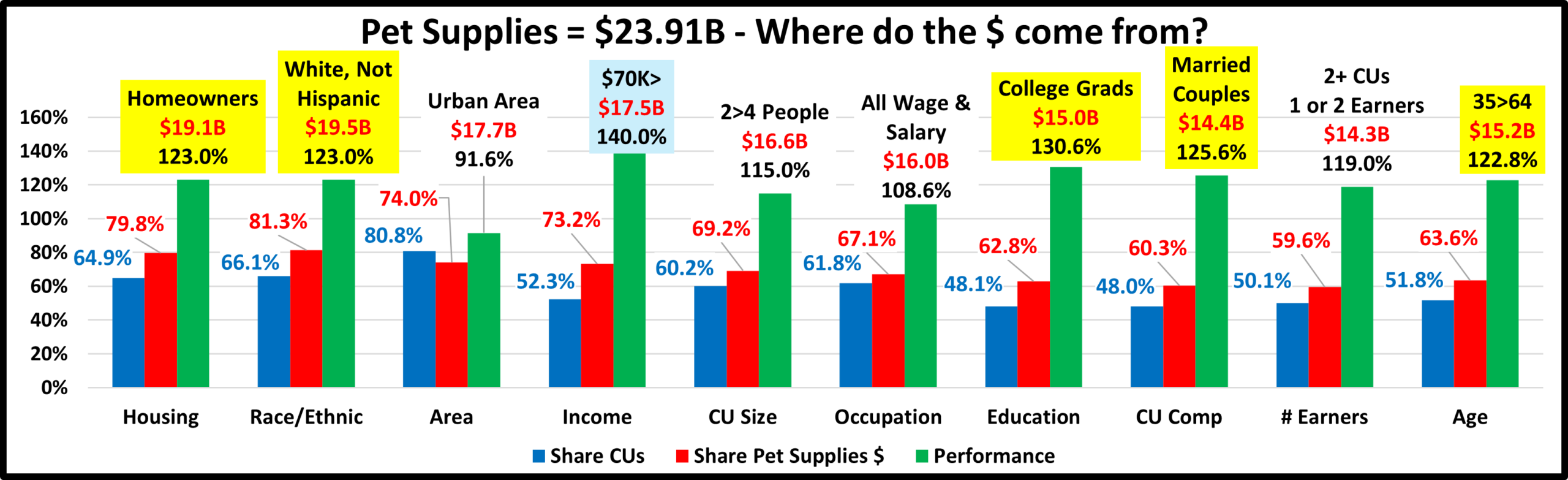 - Income Over $70K (73.2%) up from 72.1%. A gain in share, but their Performance fell from 142.7% to 140.0%. Income remains the most important factor in increased Pet Supplies Spending. $70K> spent +$0.92B more, while <$70K was -$0.03B. Only <$50K (-$0.26B) and $150>199K (-$0.87B) spent less. All others spent more. The biggest increase was +$1.37B by the $200K> group. A key factor in the increase in share but drop in performance was that $70K> gained 3.1 million CUs. This gain in CU share lowered performance.