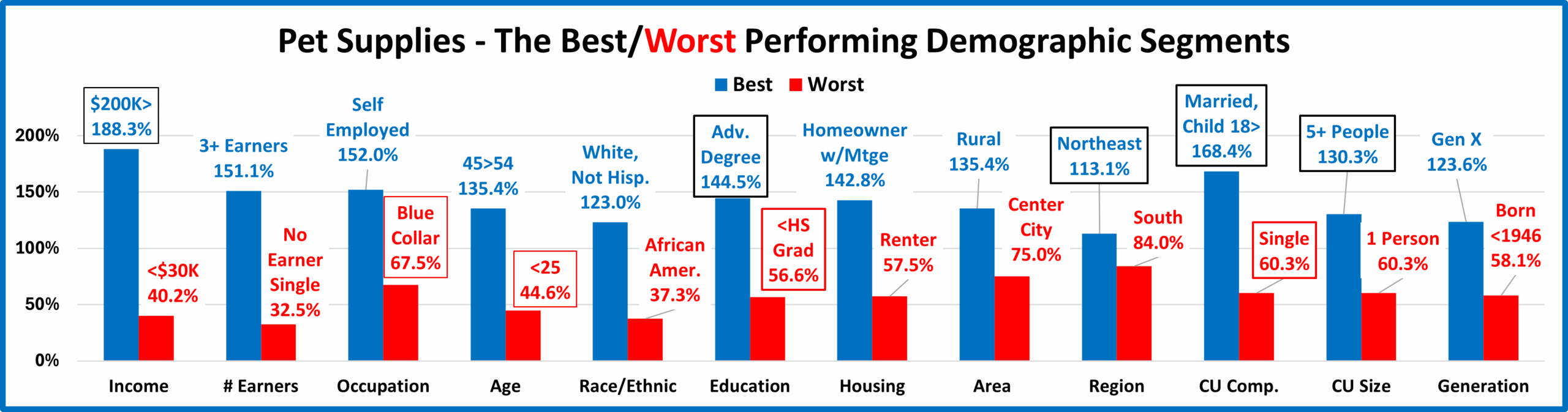 Finally – The “Ultimate” Pet Supplies Spending CU consists of 5 people – a married couple, with 3 children, one 18>. They are 45>54 yr old Gen Xers. They are White, but not of Hispanic origin. They have their own business where they both work and at least one has an Advanced College Degree. Their child also works – part time and their household income is $200K>. They live in a rural area in the Northeast and are still paying off the mortgage on their home.