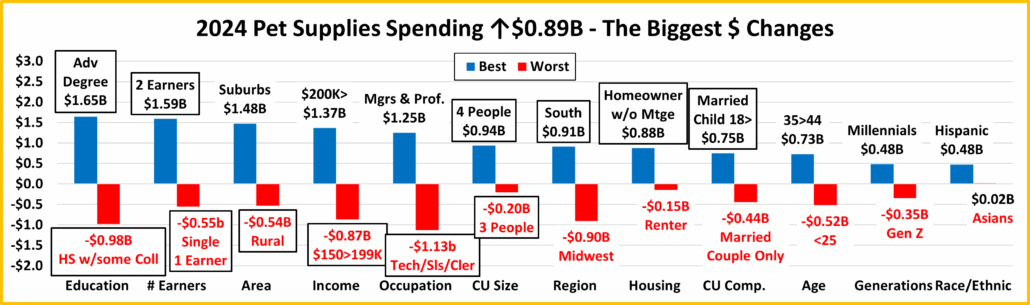 Almost all of the best and worst performers are those that we would expect. The only small surprise is 5+ CUs. In Pet Supplies spending, there are 9 that are different from 2023, up from 8 last year. That is 3 more than Veterinary & Total Pet, 6 more than Services, but 6 less than Food. They have 5 new winners. With 7, only Food has more. In terms of disparity, the difference between the avg winner & loser was 86.2%, down from 95.4% in 2023 and much less than 123.6% in 2021. A little more balanced at the segment level. Changes from 2023 are “boxed”. We should note: