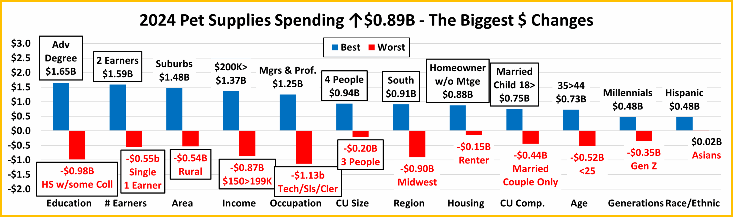 - Loser – $150>199K – Pet Supplies Spending: $3.38B; Down -$0.87B (-20.4%) 2023: $40>49K