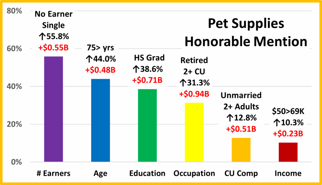 - Winner – 2 Earners – Pet Supplies Spending: $10.81B; Up +$1.59B (+17.3%) 2023: 1 Earner, Single